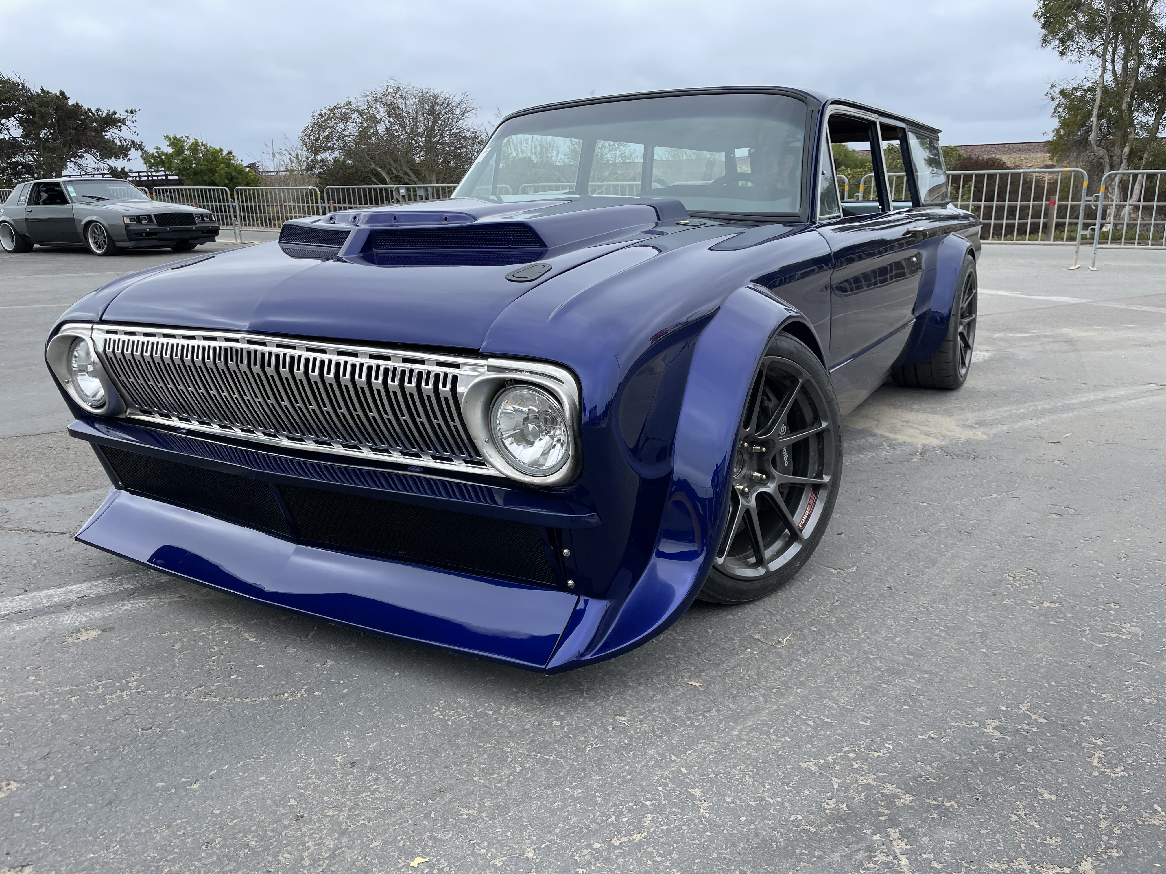 It’s a 2017 Ford GT350 with a purple Ford Falcon station wagon body on it.
